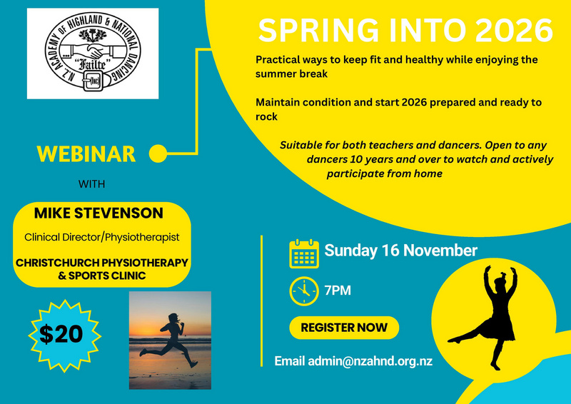 This is a friendly reminder to join us for our upcoming “Spring into 2026” Webinar with Mike Stevenson, Clinical Director and Physiotherapist, Christchurch Physiotherapy and Sports Clinic, on practical ways for dancers to keep healthy and stay fit while enjoying the summer break.